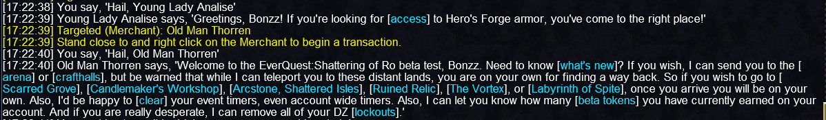 13) COLLECTOR OF TRANSFERRENCE (DON'T BUY!): In some zones (particularly city zones) you may see a 'Collector of Transference' vendor NPC. Do NOT buy anything from these NPC's. They were originally set up for the now defunct Selo server and they sold variant teleport items for Daybreak Cash ('DBC'). While you should have not have any DBC on Beta, just in case, do not buy anything from such vendors to avoid spending actual DBC!
