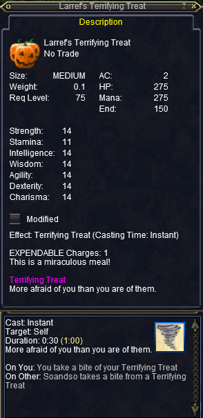 REWARD: Candy Corn (8 STR, 2 STA, 5 CHA, 8 WIS, 8 INT, 2 AGI, 90 HP, 90 Mana, 10 END, 5 Fire, 5 Cold).