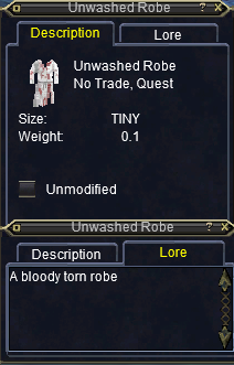 Stand in the campfire that is right there (about 15-Seconds), until you get an update for bunning the three (3) Unwashed Robe.