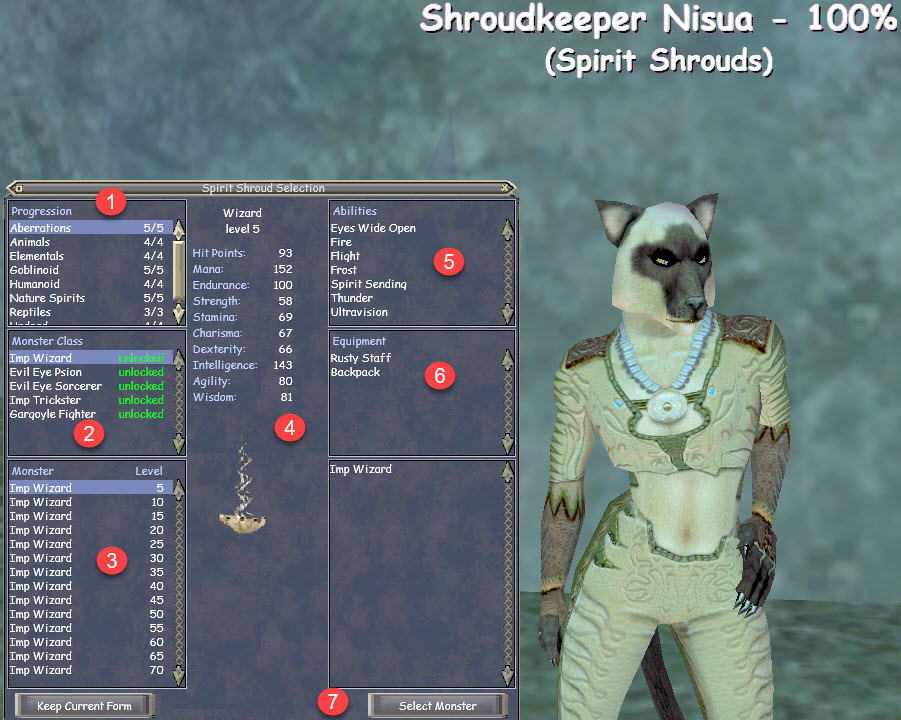 Using this window, you can selects a shroud category (#1 in above image). This will then allow you to select from the available "Monster Class" options for your selected category (#2 in above image), which then will allow you to select what level you want to be when in shroud form (every 5th Level from Level 5 to level 70) (#3 in above image).