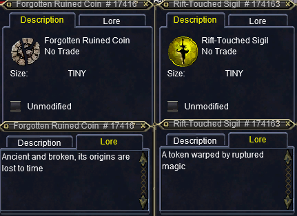 Rift-Touched Sigils was added to the game. Rift-Touched Sigils are earned via Group Missions and can be spent with Cortnia Stonebreaker and / or Grogg Harpyr (both are on Find in Scarred Grove)