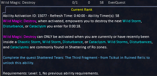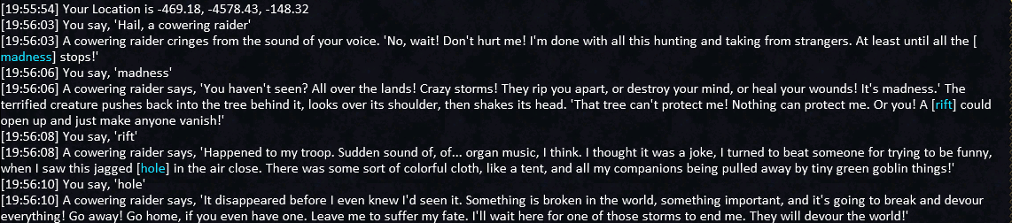 There was a Pre-Release Event in The Wakening Lands. There was an NPC (a cowering raider) who would talk to you about magical storms, but gave no task / quest. In the zone hidden among the many trees, there were four (40) 'Magical Storm' types. If you stood in one, you would get a song window effect that was a short duration Air, Earth, Fire or Water illusion (depending on which Magical Storm you stood in). Hailing a cowering raider afterwards (with or without an illusion) resulted in the same chat spam. No reward (no achievement, no item, no tile, no XP.... nothing). It has been suggested that a more complete event was planned but was then delegated as just 'flavor' due time constraints. At least it directed Players to one of the gateways for this expansion (the Scarred Grove zone line is in The Wakening Lands) and 'previewed' the new 'magical storms.'