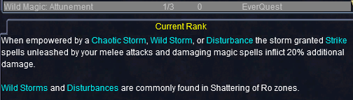 There was a Pre-Release Event in The Wakening Lands. There was an NPC (a cowering raider) who would talk to you about magical storms, but gave no task / quest. In the zone hidden among the many trees, there were four (4) variant 'Magical Storms.' If you stood in one, you would get a song window effect that was a short duration Air, Earth, Fire or Water illusion (depending on which Magical Storm you stood in). Hailing a cowering raider afterwards (with or without an illusion) resulted in the same chat spam. No reward (no achievement, no item, no tile, no XP.... nothing). It has been suggested that a more complete event was planned but was then delegated into 'just flavor' due time constraints. At least it directed Players to one of the gateways for this expansion (the Scarred Grove zone line is in The Wakening Lands) and 'previewed' the new 'magical storms.'